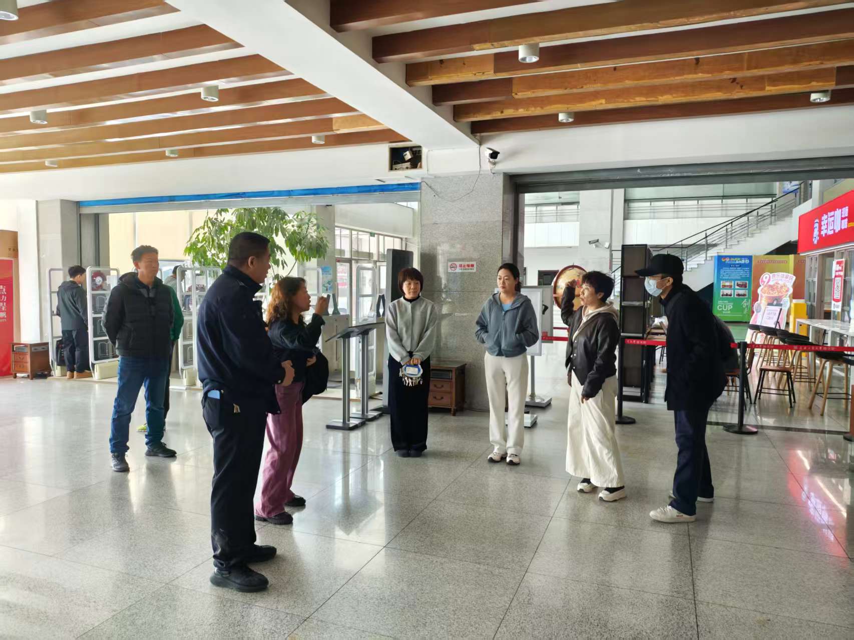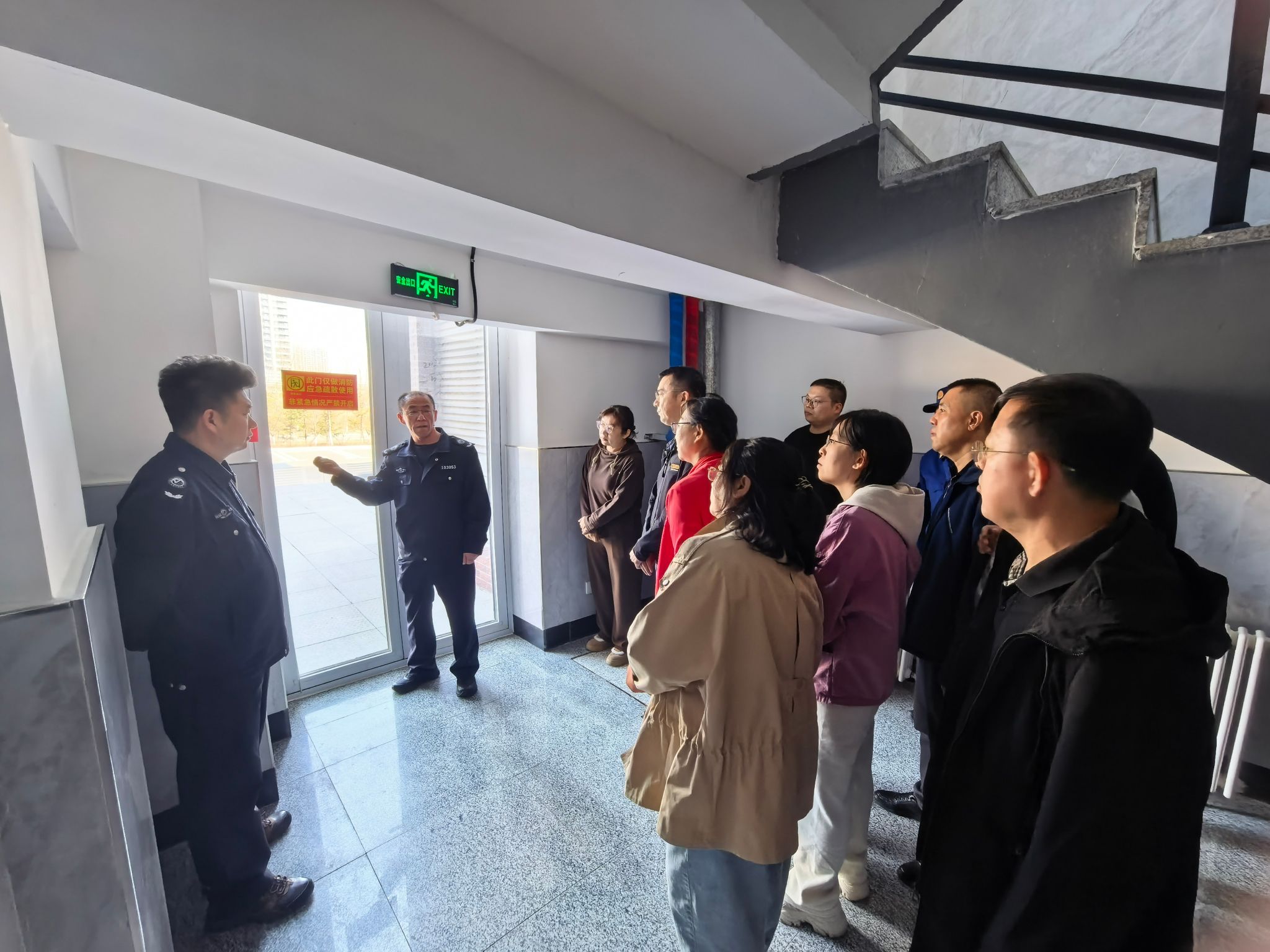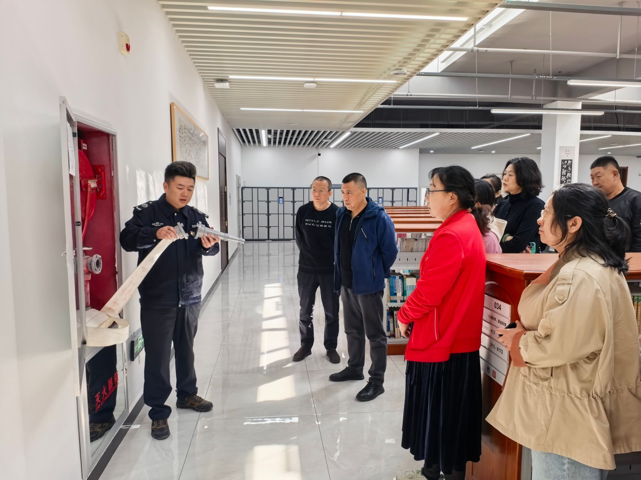 理论学习结束后,培训进入实操环节。来自保卫处的专业工作人员针对图书馆的环境特点,详细讲解了灭火器的适用场景及操作要领,重点演示了“提、拔、握、压”四步操作法,并强调了站在上风口、对准火焰根部喷射等关键细节。随后,工作人员还演示了消火栓的使用方法,讲解了不同类型火灾的扑救策略和注意事项,使馆员们对消防器材的应用有了更全面的了解。最后,在工作人员的引导下,馆员们按照预定疏散路线来到一楼消防安全出口,工作人员现场讲解消防安全门的使用和紧急情况下的处置办法。
