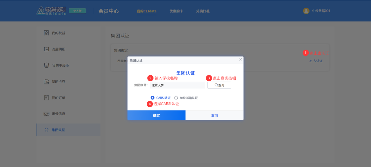 (1) CARSI认证:登录中经数据,前往【会员中心 - 集团认证】。